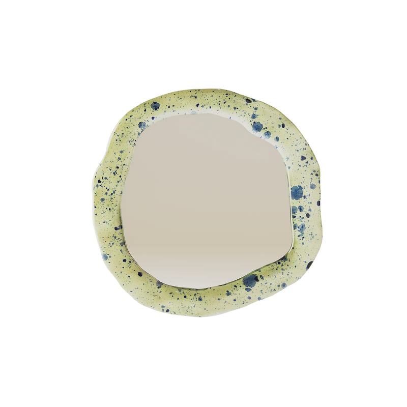 Der Punktum Spiegel wird mit Sorgfalt und Präzision gefertigt. Von Hand geformt und in hellgrünen und blauen Tönen glasiert, macht seine asymmetrische Form und die lebendige Oberfläche ihn zu einem herausragenden Dekorationsstück. Die organische Form und das gesprenkelte Farbschema sind sowohl erfrischend als auch vielseitig, was ihn perfekt für eine Vielzahl von Innendesigns macht.