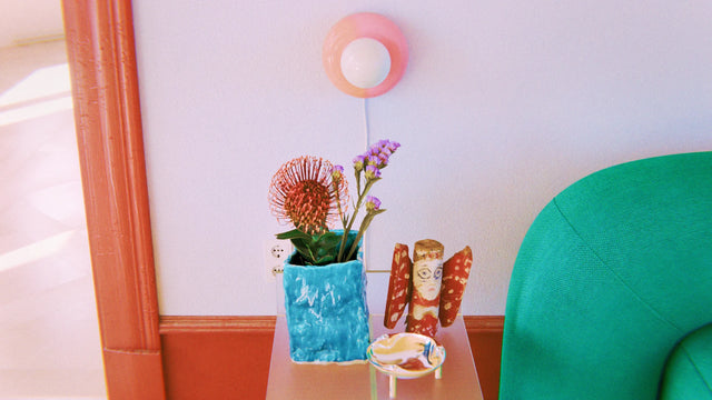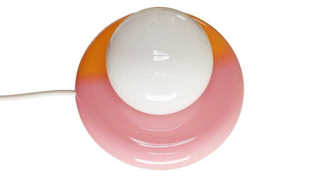 Jede Lampe wird von Hand geformt und bemalt, wodurch ein natürlicher Übergang zwischen Orange und Pink entsteht. Der Farbverlauf wird mit Präzision aufgetragen, was jedem Stück seinen eigenen, unverwechselbaren Rhythmus und visuelle Tiefe verleiht.