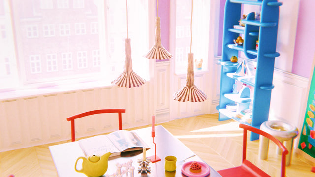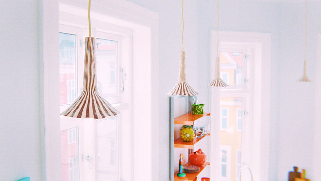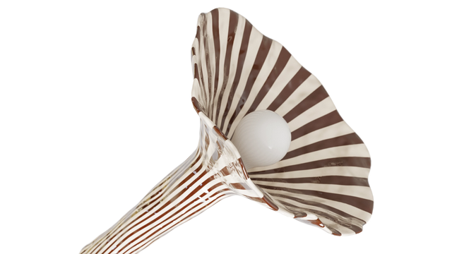 The small Doodle lamp brings sculptural character to more intimate spaces. Its compact, flared silhouette is accentuated by flowing brown and cream stripes that radiate from top to brim, highlighting its rhythmic geometry. Though smaller in scale, it holds a strong graphic presence, casting a warm, focused glow ideal for bedside settings, reading corners, or clustered compositions.