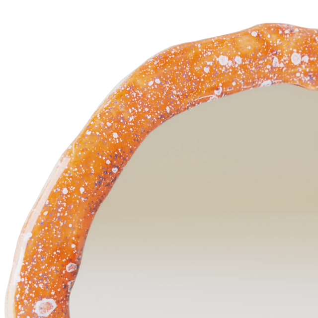 The Punktum Mirror is shaped and glazed by hand, ensuring that no two pieces are exactly alike. Its frame, inspired by organic forms and asymmetry, is carefully modeled and glazed in a unique blue and orange color combination. This vibrant mix gives the mirror a lively personality, whether it’s hanging in a minimalist setting or complementing a bold interior design.
