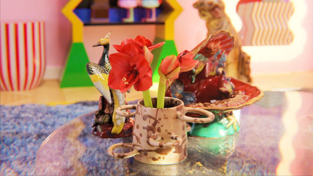 Ogni vaso 90° è realizzato al tornio del vasaio, poi rifinito a mano. I manici sono modellati con cura e attaccati, creando un equilibrio visivo sorprendente tra struttura e forma. Ogni pezzo incarna la dedizione dell'artista nell'esplorare estetiche non tradizionali, rendendo il processo importante quanto il risultato.