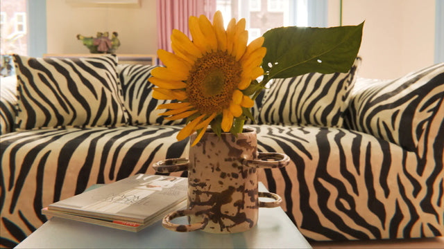 La maestria artigianale di Punktum Keramik onora la bellezza del fatto a mano. La superficie del vaso è dipinta con cura in tonalità di marrone terroso e bianco, creando motivi unici come le mani che l'hanno modellato. Questa combinazione di funzionalità e arte riflette la visione dell'artista di spingere i confini rimanendo profondamente radicata nelle tecniche tradizionali della ceramica.