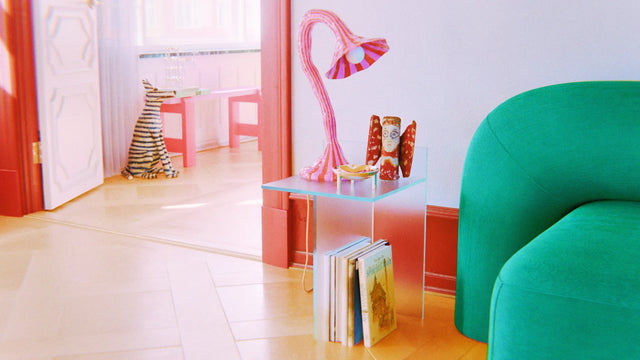 The Doodle table lamp bends in a confident, hand-shaped curve, transforming functional lighting into an expressive statement. Vibrant orange and pink stripes spiral from the grounded base to the flared shade, amplifying its sense of movement and rhythm. The dynamic silhouette frames the bulb in a playful sweep, casting a warm, inviting glow. An incorporated toggle switch ensures intuitive use, seamlessly integrated into the sculptural form.