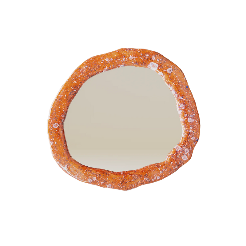 Lustro Punktum jest kształtowane i szkliwione ręcznie, co zapewnia, że nie ma dwóch identycznych egzemplarzy. Jego rama, inspirowana organicznymi formami i asymetrią, jest starannie modelowana i szkliwiona w unikalnej kombinacji kolorów niebieskiego i pomarańczowego. Ta żywa mieszanka nadaje lustru o żywej osobowości, niezależnie od tego, czy wisi w minimalistycznym otoczeniu, czy jest uzupełnieniem odważnego wystroju wnętrza.