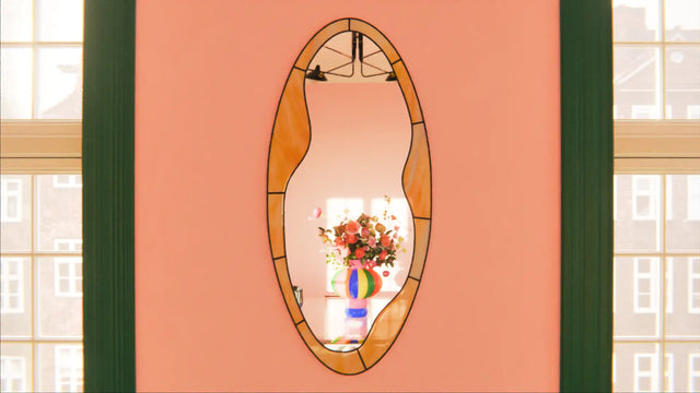 Inspireret af naturen har spejlets ramme subtile, flydende kurver, der får det til at føles organisk og harmonisk. Det farvede glas tilføjer ikke kun en følelse af bevægelse, men reflekterer også lyset på en blid, omgivende måde, hvilket gør det til en fængslende tilføjelse til ethvert rum.