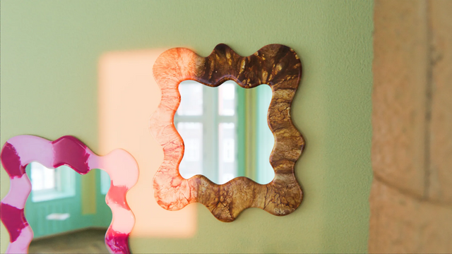 Spejlet kombinerer epoxyharpiks, MDF og glas for at skabe et holdbart og visuelt iøjnefaldende stykke. Den anvendte epoxyharpiks er organisk, hvilket giver kunstnerisk frihed og resulterer i unikke, enestående ufuldkommenheder, der tilføjer spejlets charme.