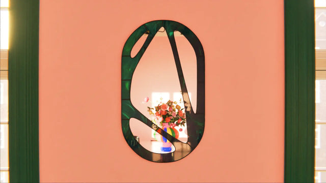 PORTAL N-03 spejlet er indrammet med udsøgt farvet glas, farvet i dybe smaragdnuancer, der minder om frodige skove og kostbare sten. Håndlavet med præcision, er hvert stykke glas omhyggeligt arrangeret for at reflektere lys på en fortryllende måde, der forvandler ethvert rum til en fredfyldt oase.