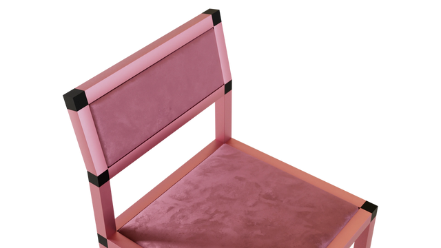 Pink velvet enriches the design with softness and a gentle luminosity. Its plush texture contrasts the crisp frame, creating a harmonious interplay of color, comfort, and form that enhances the chair’s expressive identity.